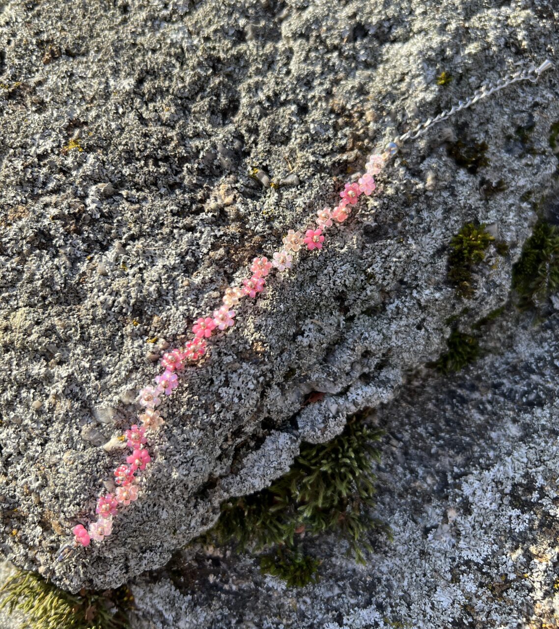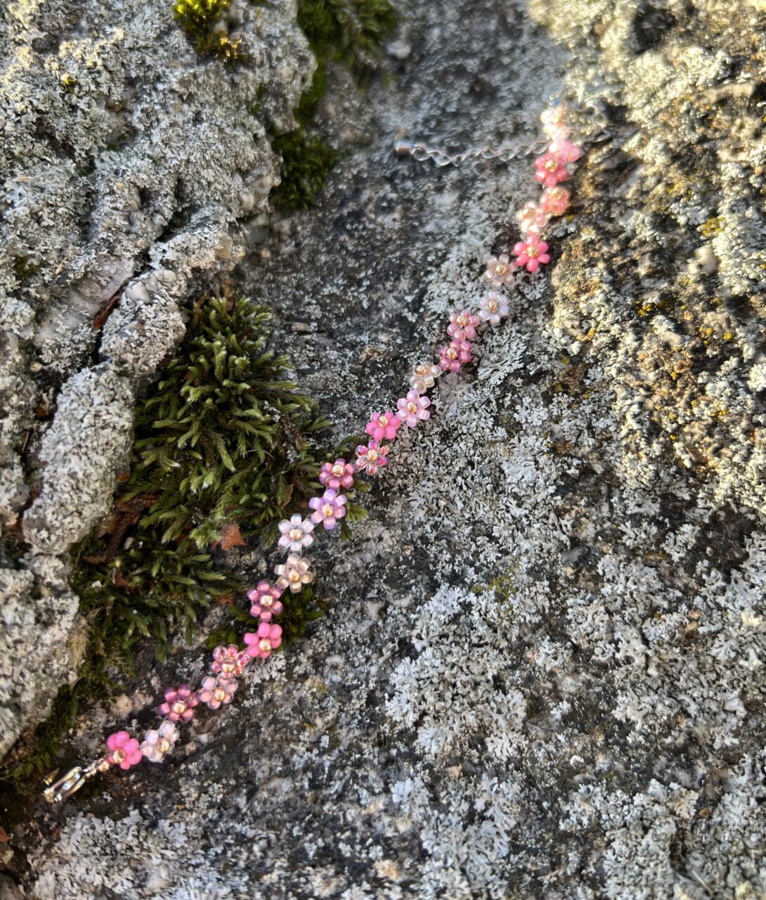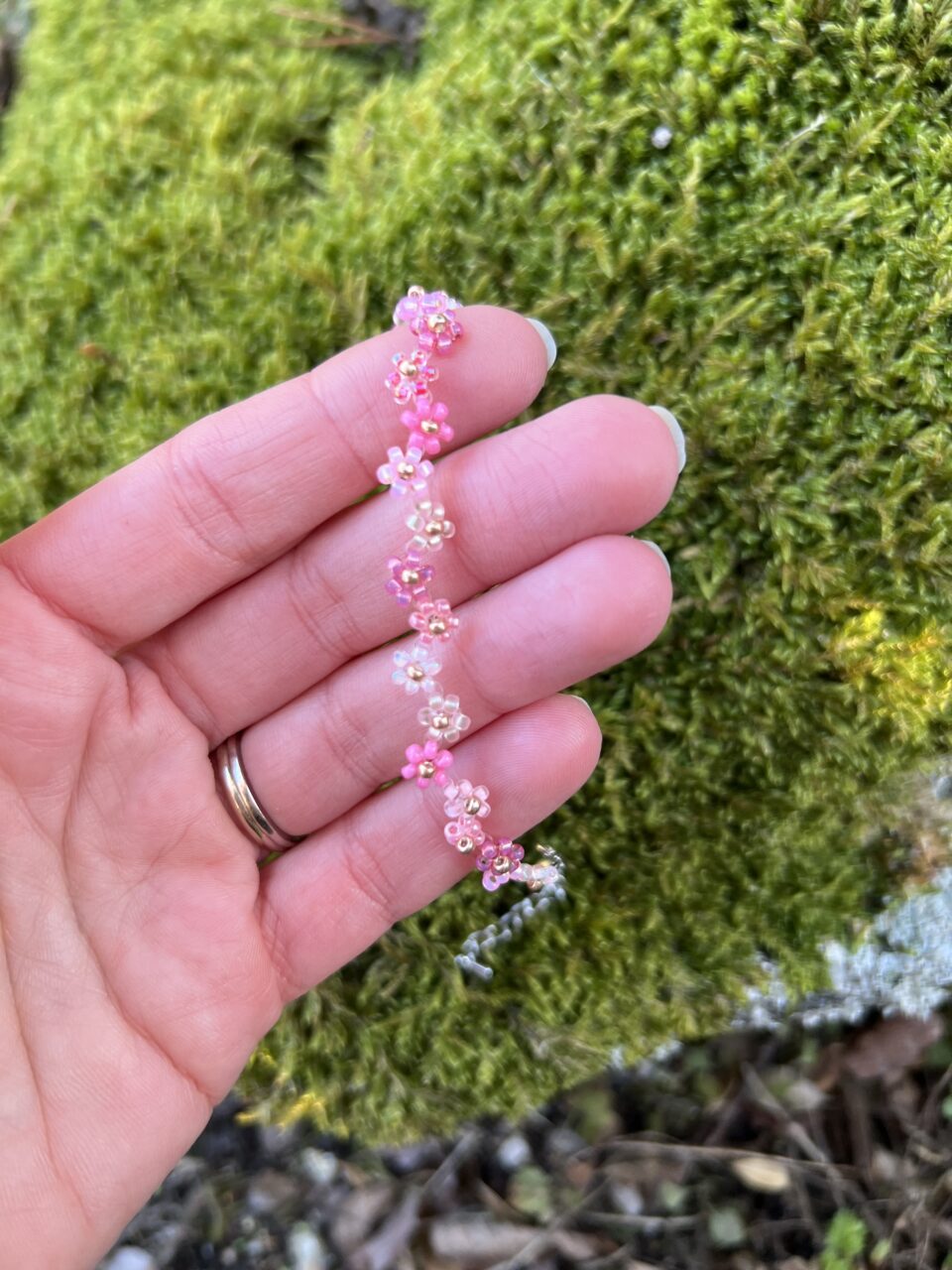 Náramek pletený z odolného vlasce pomocí japonských korálků Miyuki v designu rozkošných kytiček.