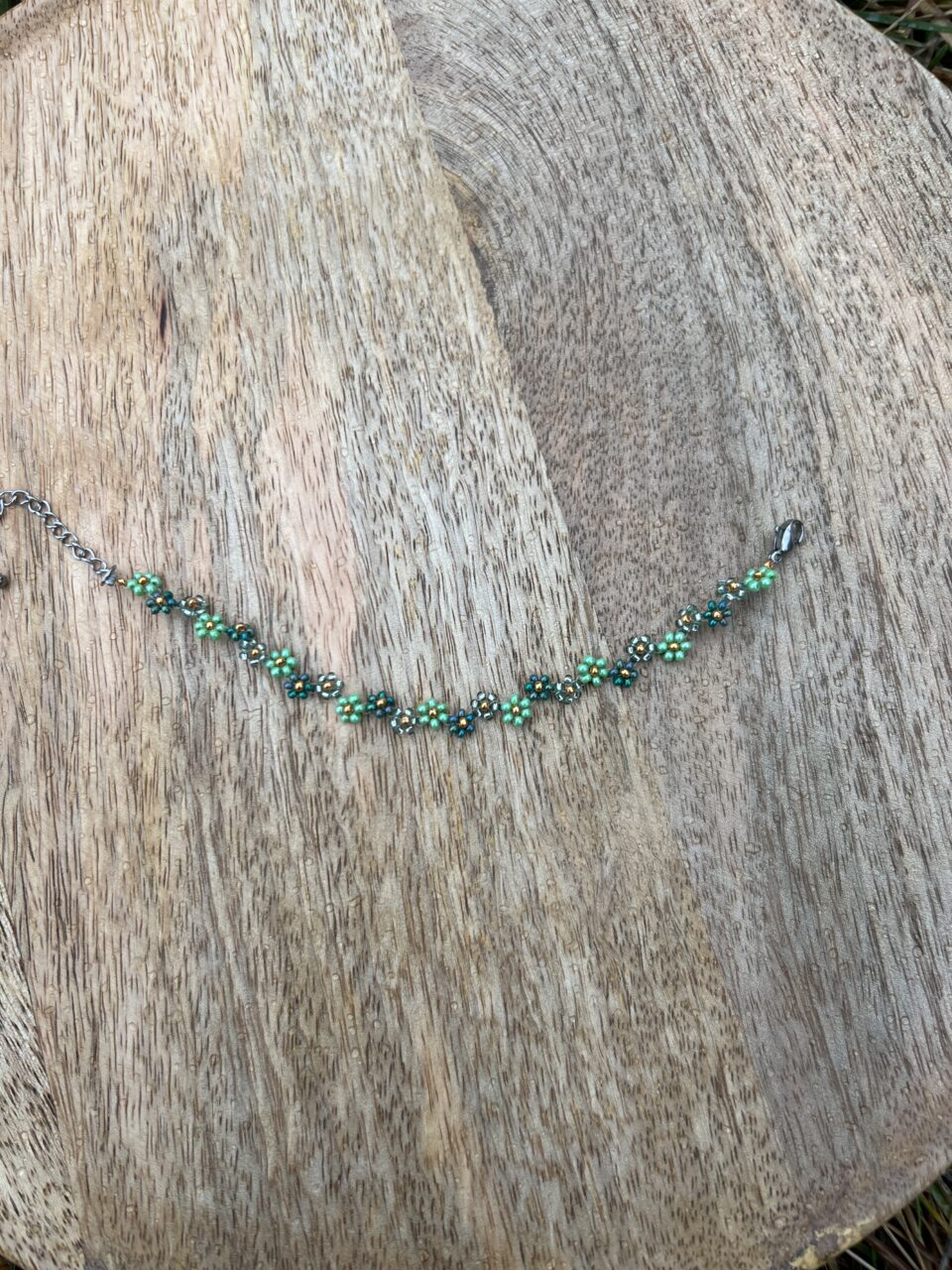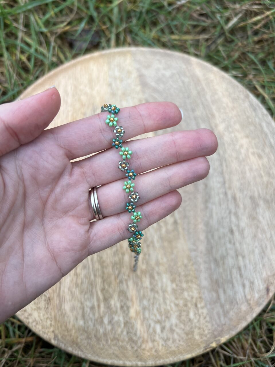 Náramek pletený z odolného vlasce pomocí japonských korálků Miyuki v designu rozkošných kytiček.