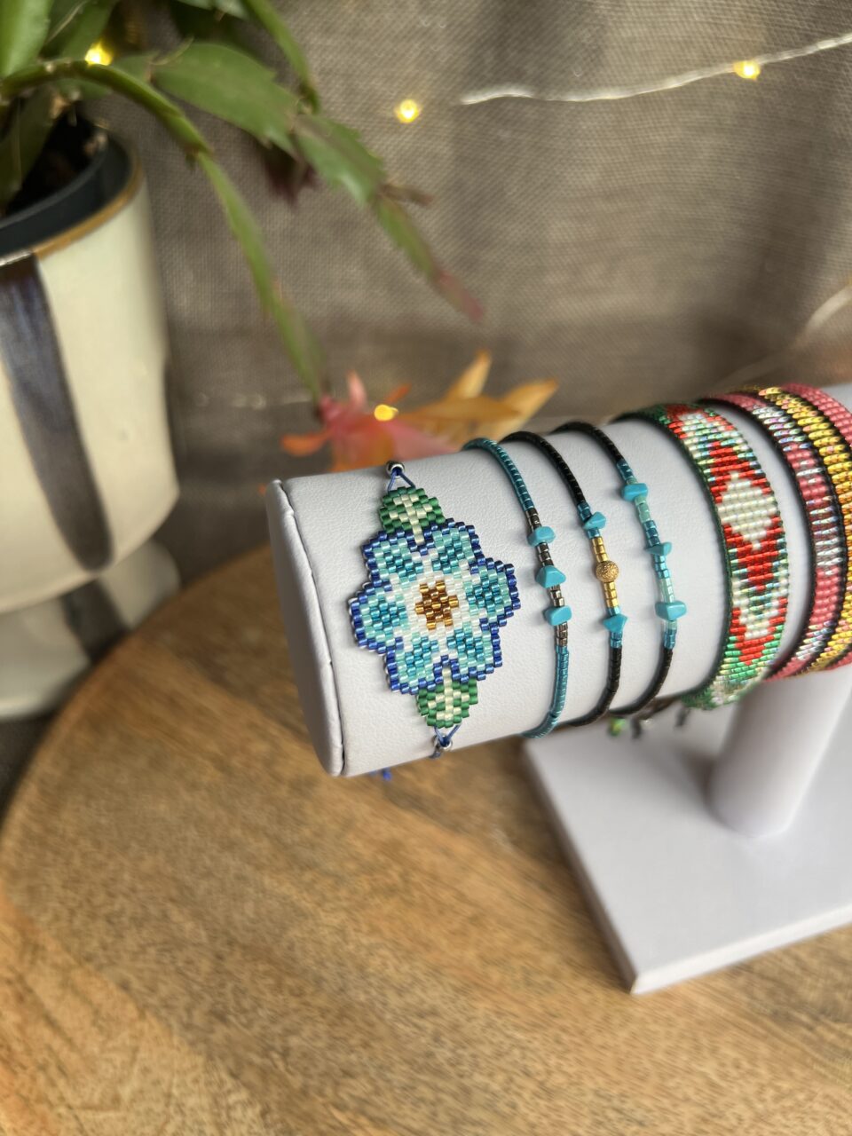 Jedná se o rokajlové korálky japonské výroby vyznačující se vysokou kvalitou, leskem a tvarovou přesností. Náramek je šitý kvalitní nilonovou nití.